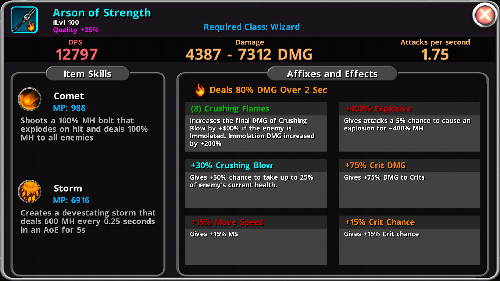 is this Wizard part of a Main & Hireling team? you have Ruptured which increases DMG to Bleeding enemies, but I don’t see any Bleed Chance or Blistering. I guess the other Character causes Bleed? if it isn’t a Team, you could change Shatter to Scalp, which has a 100% Bleed Chance, or change one of your Crit Chance to Legend Blistering or Epic +10% Bleed Chance (+55% crit chance down to +40% crit chance).