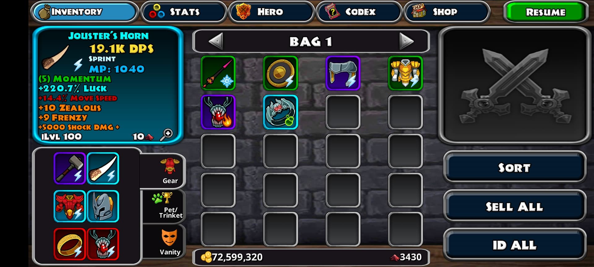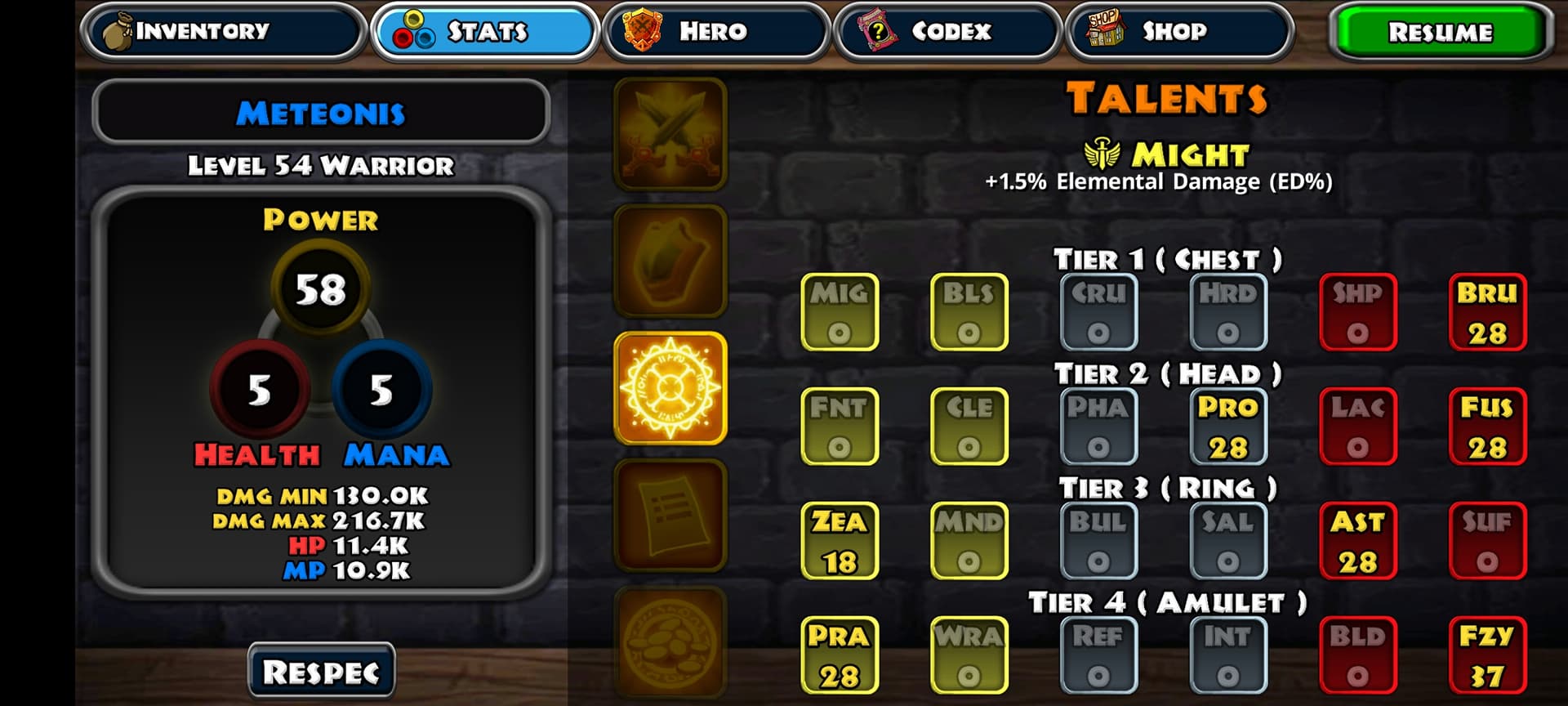 on Horn, change Epic +5000 Shock+ to either Epic +15% Block or Epic +10% Dodge. or Epic +10 for a Talent.