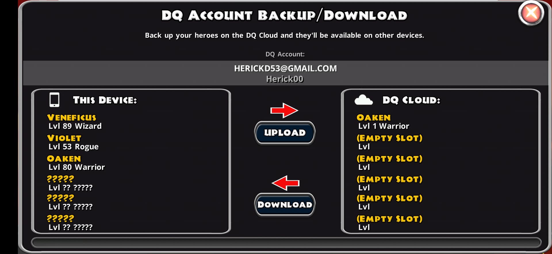 To conectado no Gmail herickd53@gmail.com só que meu personagem então LV 99 mais quando vou fazer o upload já tem uns personagens LV 1 conectado nela e não consigo salvar meus personagens LV 99, tem como limpar a minha conta com personagem LV 1 pra eu salvar os personagens de LV 99?